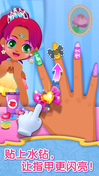 美甲设计:细心修剪公主的指甲,为其搭配独特的贴纸和珠光水钻,让指甲在灯光下闪闪发光。