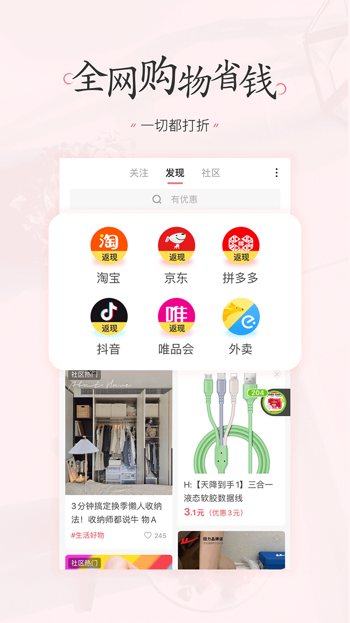2、进入“省钱”专区,用户可在此跳转至多个平台选购商品,大部分平台都提供返现优惠。