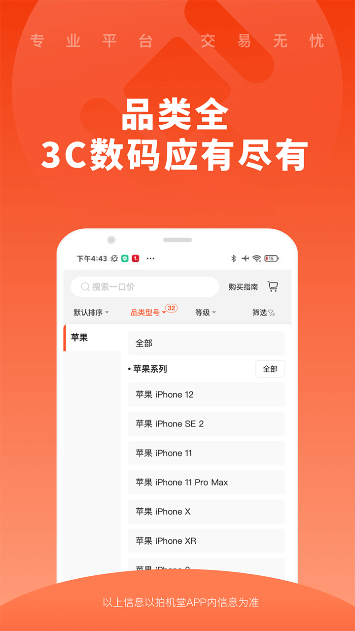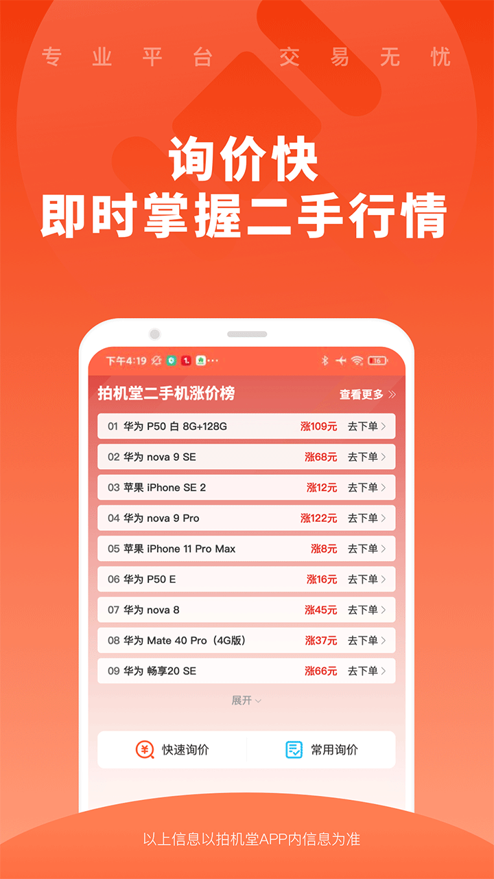 拍机堂专注于二手数码产品的交易,集合了丰富的商品信息与货源,方便用户进行买卖操作。无需中间商,直接对接卖家,提升交易效率和透明度。平台提供专业质检和分级服务,保障手机等数码产品品质可靠。通过系统化检测流程,让用户放心交易,享受无忧的购销体验。
