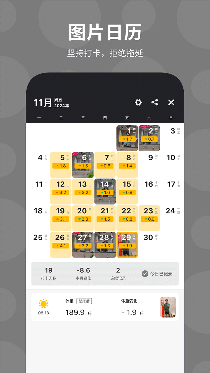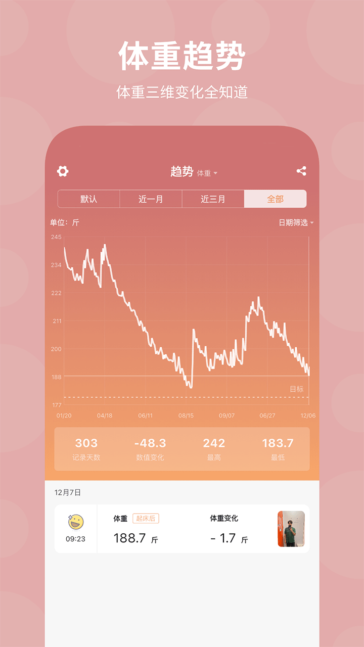 1、多维数据记录,涵盖体重、体脂、BMI、腰围等,全面掌握健康状态。