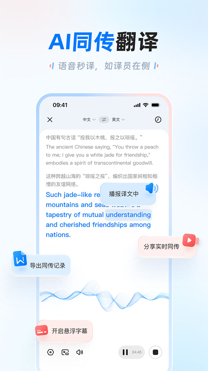 1、语音翻译,清晰发音、减少噪音,提升识别准确率。
