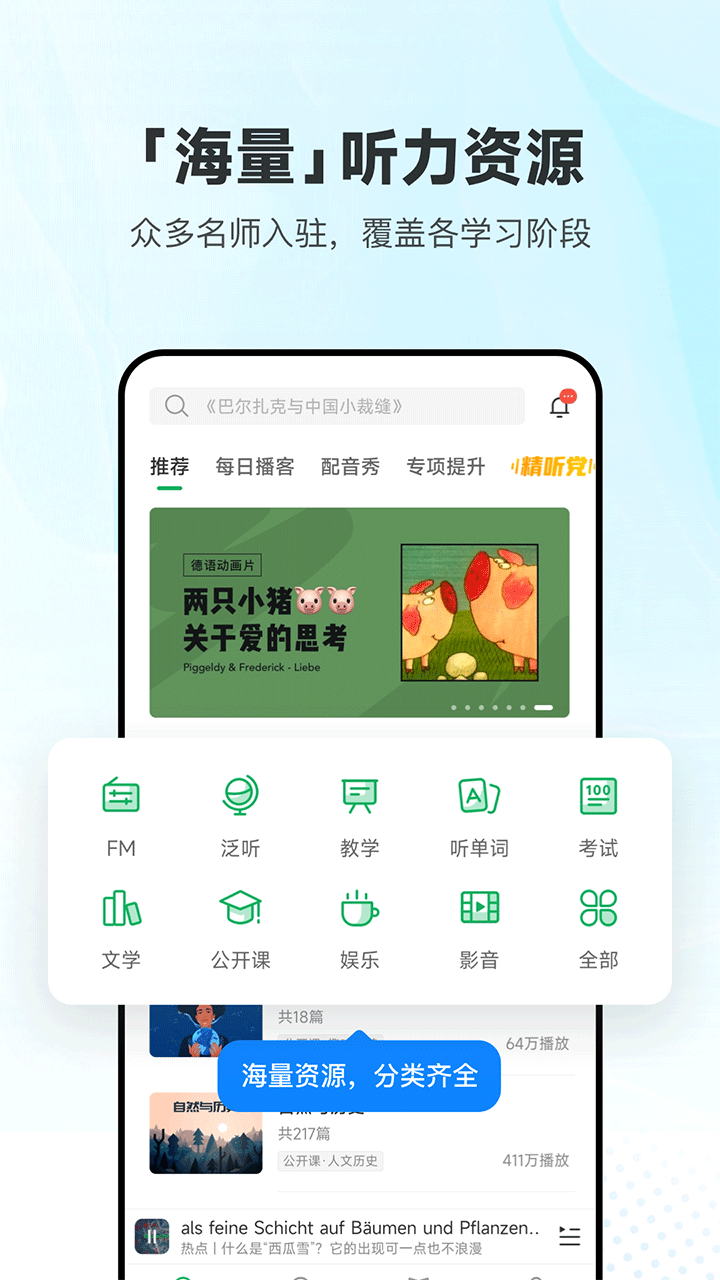 5、开放上传支持字幕,精听配音玩法丰富。
