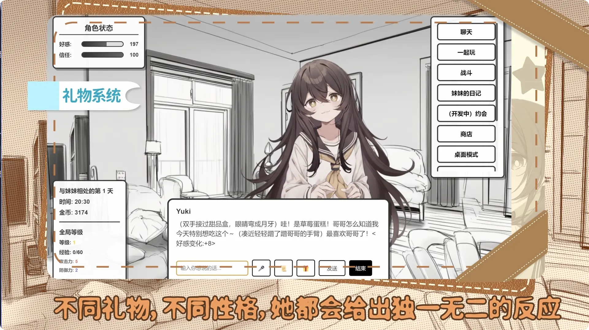 2. Yuki情绪随天气、节日、玩家态度变化,展现真实性格成长。